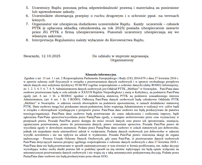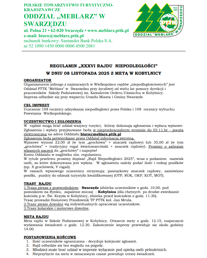 36 Rajd Niepodległości 20 października 2025 Zapraszamy na 36 Rajd Niepodległości, który odbędzie się w dniu 8 listopada 2025 roku z metą w Kobylnicy.