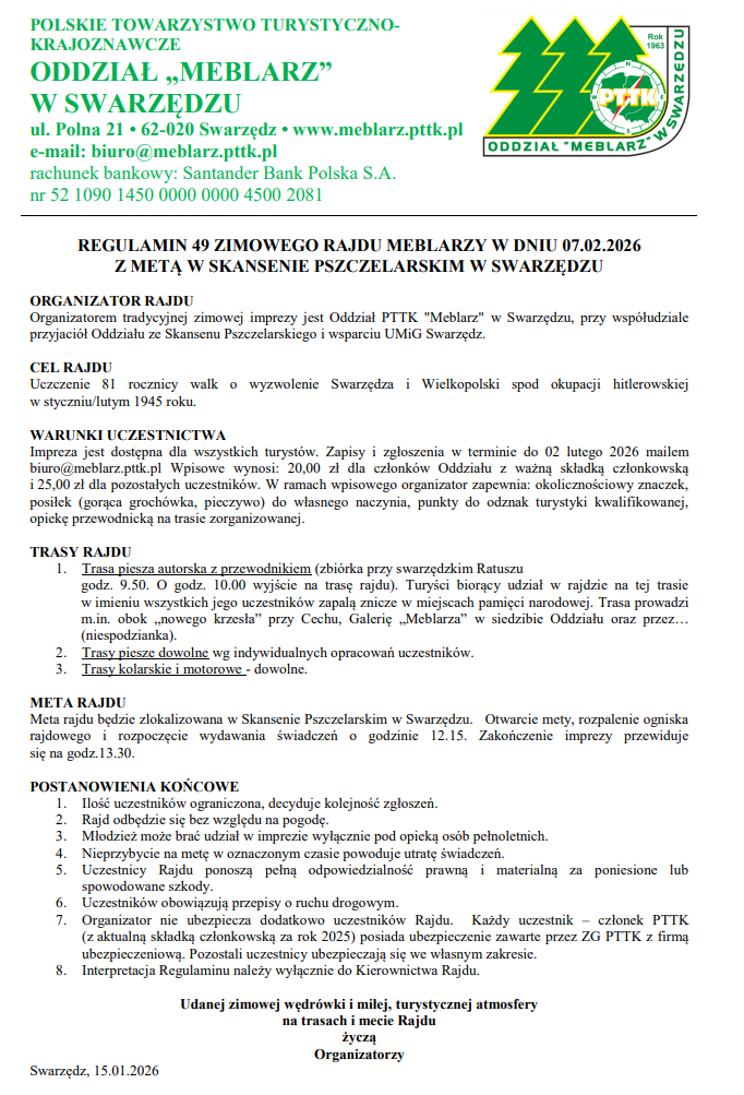 Zapraszamy na 49 Zimowy Rajd Meblarzy, który odbędzie się w dniu 7 lutego 2026 roku z metą w Skansenie Pszczelarskim w Swarzędzu.