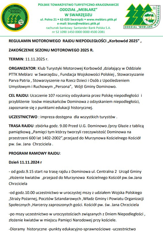 Motorowy 11 listopada 12 października 2025 Zapraszamy na Motorowy Rajd Niepodległości organizowany przez KTM „Korbowód” w dniu 11 listopada 2025 roku.